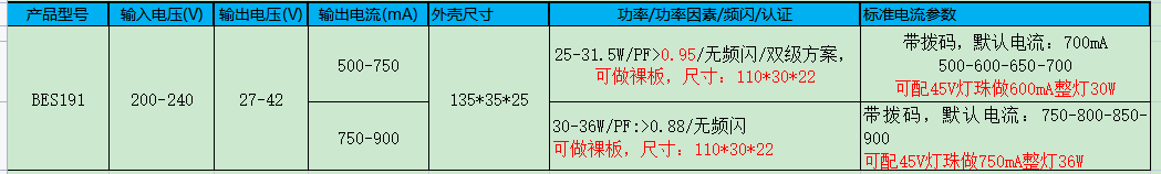 产品编号 : 输入电压:200-240V 输出电压:27-42V 输出电流:500-750mA 输出功率:25-31.5W