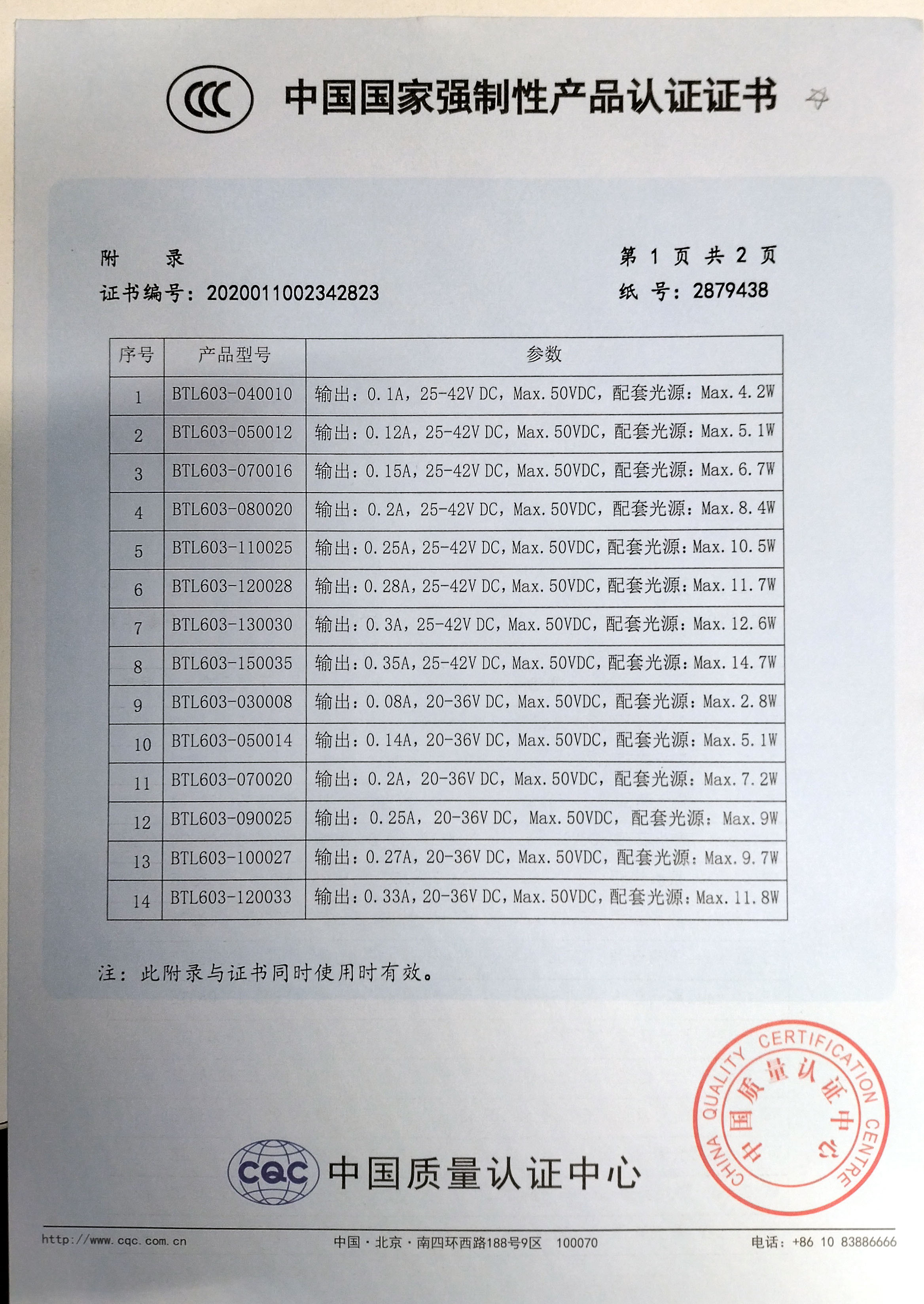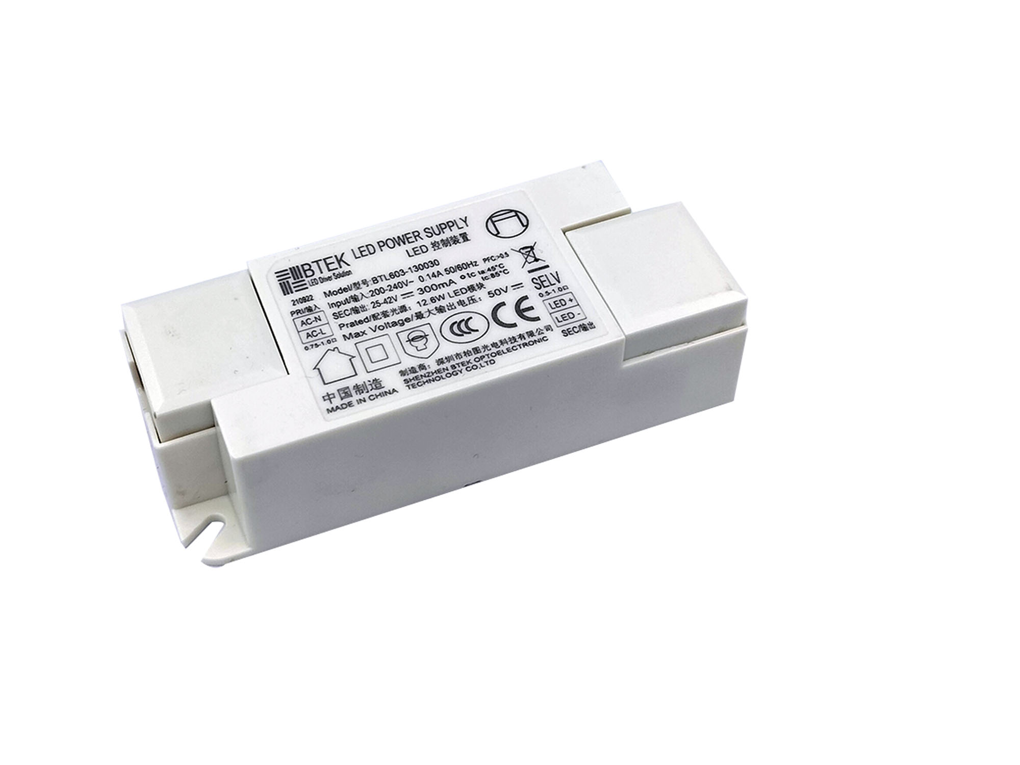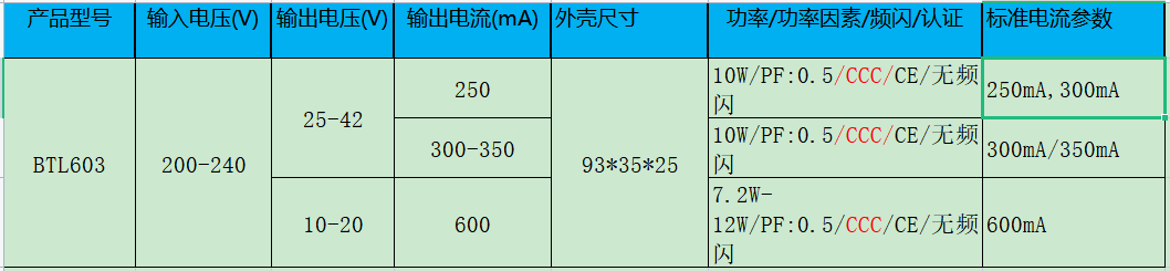 该产品型号为BTL603,体积小,两边端盖,接线方便,能有25-42V或10-20V的电压,输出电流可到250/300-350/600mA,功率可达10W/12-15W/7.2W-12W,无频闪。