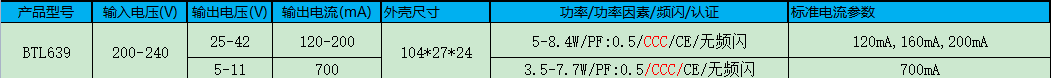该产品型号为BTL639,体积小,两边端盖,接线方便,能有25-42V或5-11V的电压,输出电流可到120-200mA/700mA,功率可达5-8.4W/3.5W-7.7W,无频闪。